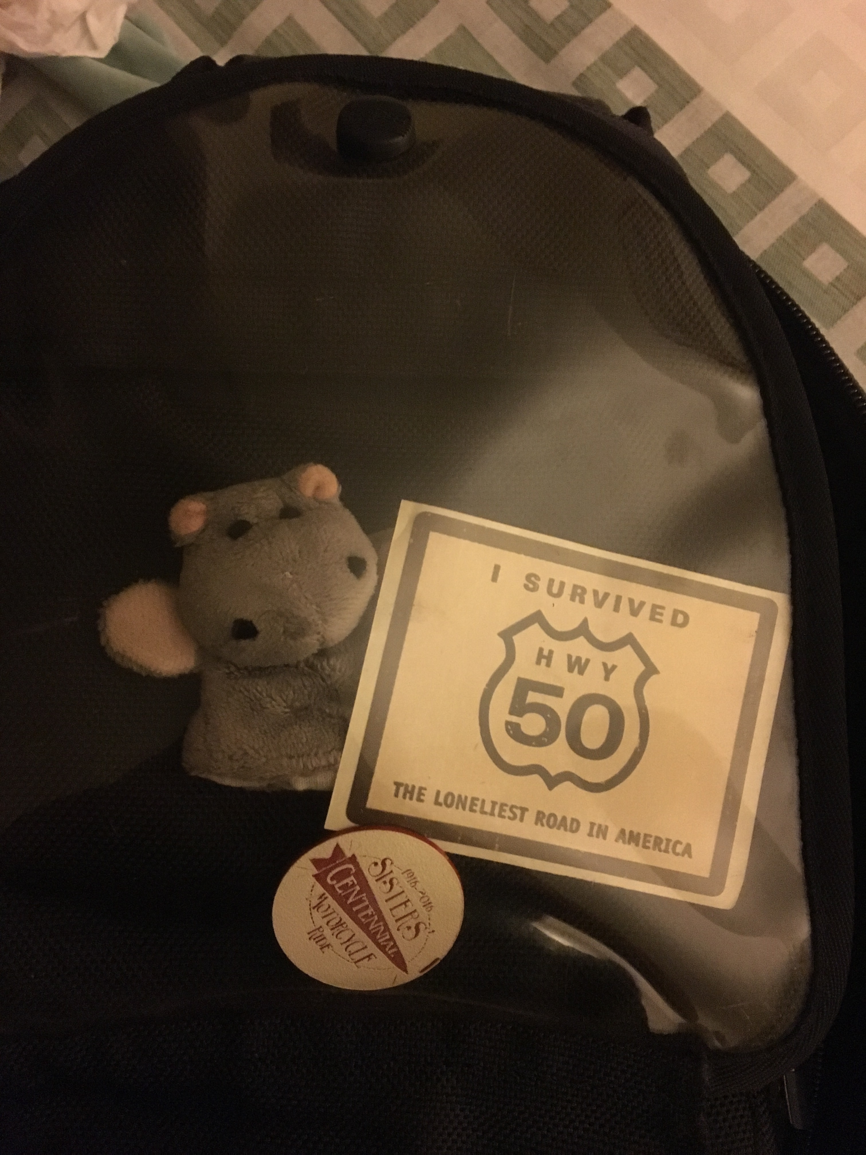 At about the half way point, we stopped to fuel up at the Chevron in Austin, Nevada. A tiny gas station with a large selection of “I survived HWY 50 the loneliest road in America” paraphernalia. I bought the t-shirt and even Hippo got in on the fun. As I said, diversions were few and far between.